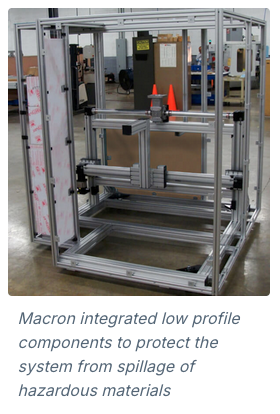 Macron integrated low profile components into the XZ linear robotic system to prevent hazardous materials from making contact with the machine’s parts. To meet the enclosed and mobile design requirements, Macron constructed the linear robot’s outer structure with MacFRAME aluminum extrusions and panels, while mounting the entire framed system on wheels.