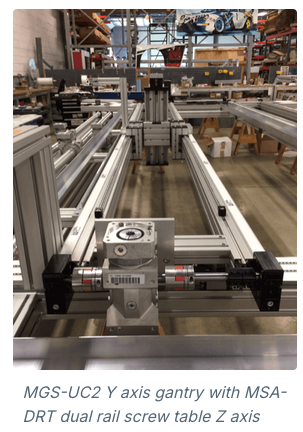 Solution: Macron Engineers developed a large footprint 21 axis gantry system, approximately 4 meters wide by 10 meters long. This system included seven MGS-UC2 MacSTANDARD linear gantries with MSA-DRT screw tables to provide mounting for the drilling heads. This allowed for rigid Z axis vertical motion and the absorption of vibration and forces during operation. Macron chose the UC2 design to meet the travel span and desired deflection specifications of the project. Plus, the seven systems were identical, which reduced spare parts inventory requirements and maintenance.