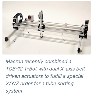 Macron recently delivered an XYZ pick and place gantry to a biotechnological machine manufacturer to be integrated into their tube sorting system.
